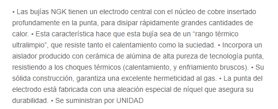 Ancho de llave: 20,8 mm. Diámetro de la rosca: 14,0 mm. Longitud de la rosca: 12,7 mm. Distancia entre electrodos: 0,7 mm. Indicada para Motor JOHNSON Mercruiser: 33-807S, 33-811S, 33-82371M, 33-896323, 33-896329807, 33-8M0114739, 33-8M0114740, 53098, 807S, 8180031, 82371B, 82371M, 832443, 8M0114739; NGK Spark Plugs: 5110, B7HS; OMC/Johnson/Evinrude: 0502189, 0509568; Yamaha: 94701-00040, 94702-00040, B7H-S0000-00-00, B7H-S1000-00-00; Kawasaki: B7HS; Honda: 98076-57740; Champion Spark Plugs: 811M, L82C