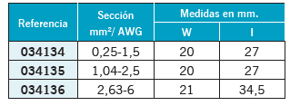 Material aislante: PP. Material terminal: Latón estañado. Voltaje y temperatura máximos de uso: 600v. -75ºC.