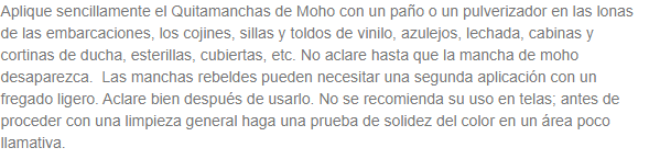 Elimina rápidamente las manchas de moho y de humedad. Utilizable en cualquier tejido, skai, vinilo, colchoneta, lona, toldo, plástico, revestimiento o superficie de gel coat. Apto para superficies del baño, cocina y juntas de alicatado y silicona. Envase. 750ML spray