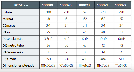 • Fabricadas en PVC con base de tela de poliéster de alta tenacidad 1100 DTCEX de alta calidad específicamente tratado para una óptima resistencia a los rayos UV. • Suelo hinchable en forma de V. La quilla hinchable proporciona una mejor estabilidad y una mayor capacidad a bordo dejando espacio para los pies de los ocupantes. • Equipamiento estándar: Banco de asiento,remos,bomba de airede pie,kit de reparación y bolsa de transporte.